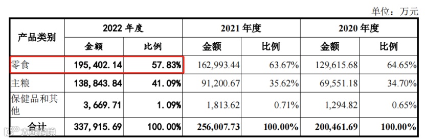 其中,零食贡献最大,2022年的收入为19.5亿元,占比57.83%