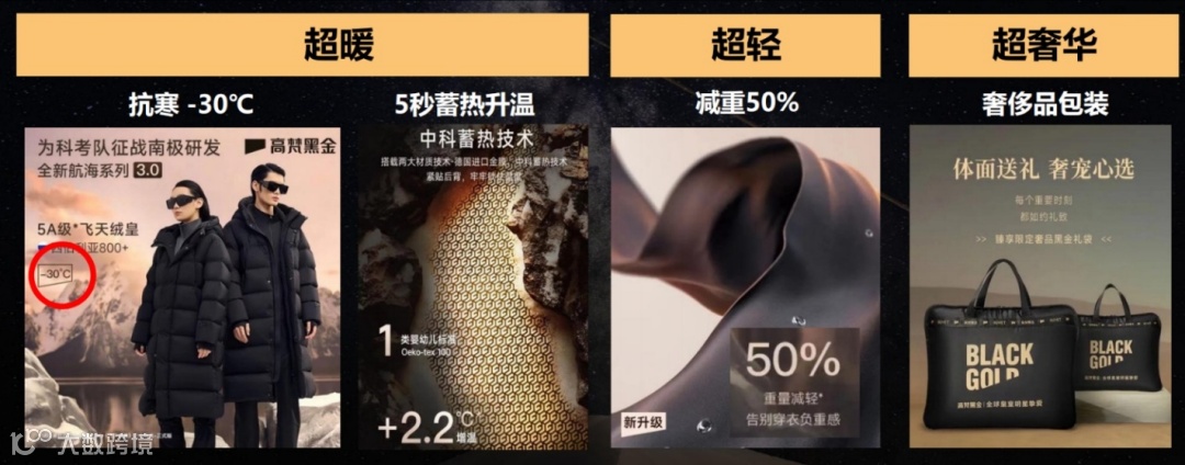 羽绒服行业发明专利数量第一、与雪龙号科考船历经极地全球航海极端测试、央视评测完胜加拿大鹅等等;