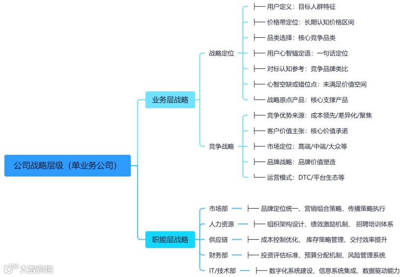 这些战略主张会决定一家公司选择哪类用户、在哪个价格带竞争、用什么语言沟通、用什么节奏扩张。如果将视角再拉远一些,回到公司战略的整体结构上来看: