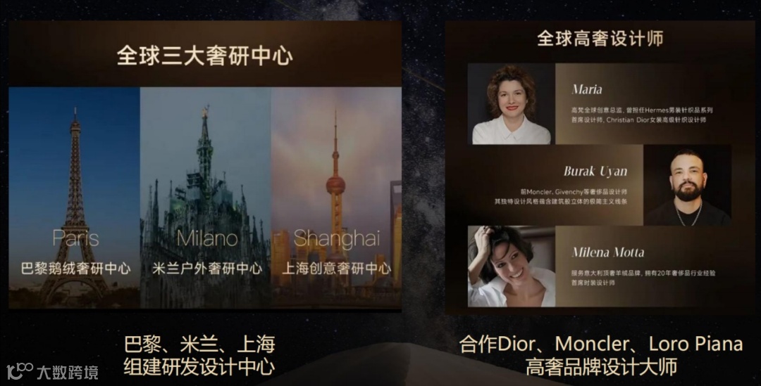 在全球成立巴黎奢研中心、上海创意奢研中心和米兰户外奢研中心,共同构成了高梵在研发端的国际化版图。聘请前Dior、Moncler、Loro Piana等高奢品牌设计大师。