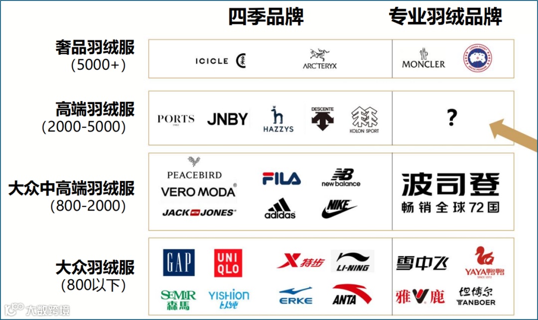 如波司登,价格集中在800–2000元之间,通过品质提升与形象升级推进“去低端化”;市场占比约36%。