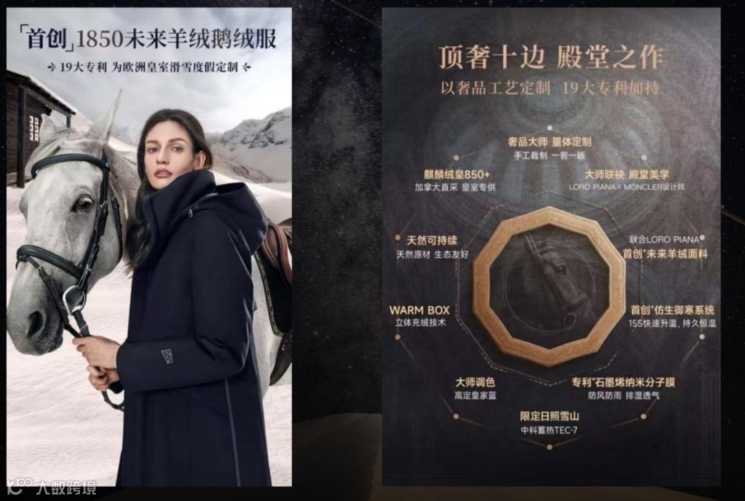 制造稀少的“顶奢”产品,首创“1850未来羊绒鹅绒服”,19大专利,顶奢殿堂之作;