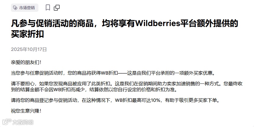 Wildberries平台推出新规:我们报名参加促销的商品,平台将提供最高10%的额外折扣,且该折扣成本由平台承担,不影响我们的结算回款。