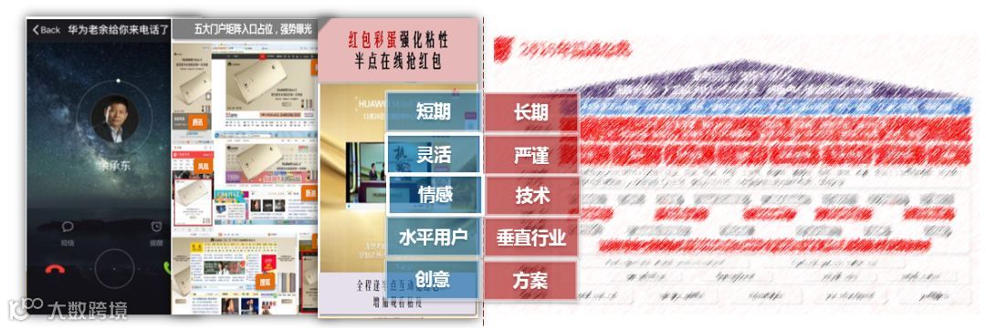 左边是终端消费领域经常使用的手段:如有趣的互动页面、短期密集的门户网站广告投放、结合热点话题的线上直播、红包抽奖等。右边的“小房子”则是很多企业都喜欢使用的品牌MessageHouse,它包含了从品牌理念到战略目标、从整体市场到各细分市场、从用户感知到购买行为的流程化体系化的整体架构。