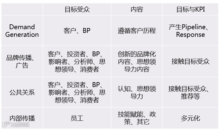 从受众来说,有可以分为潜在客户、分析师、意见领袖(KOL),以及内部员工等多种角色;