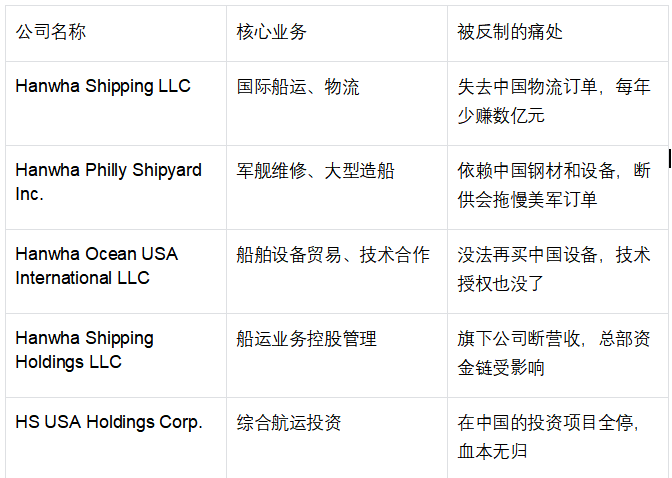 美国找茬需要“帮手”,韩华海洋的 5 家美国子公司正好凑了上去。这几家公司不是小角色:Hanwha Philly Shipyard Inc. 是美国东海岸唯一能造大型军舰的船厂,还在给美国海军修 “沃利・施艾拉” 号军舰;另外几家要么做船运,要么搞设备贸易,跟中国市场联系特别紧。