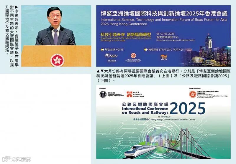 他表示,第一場是「博鰲亞洲論壇國際科技與創新論壇2025年香港會議」,第二場是「公路及鐵路國際會議2025」,將分別於6月6日至7日及6月12日至13日舉行。