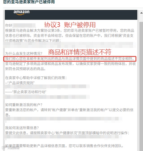 很多卖家因描述与商品实际情况不符,收到了账户停用通知。