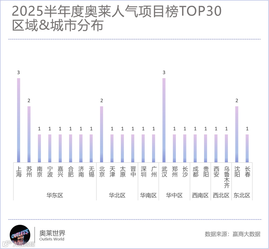 区域分布上,上半年奥莱人气项目TOP30超1/3集中于华东区,华中区次之。