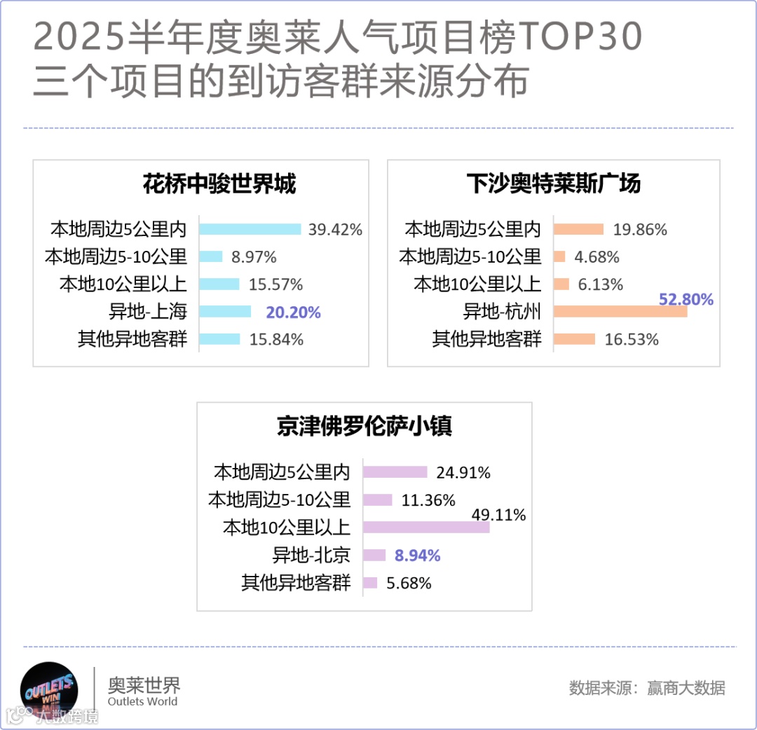 诸如【花桥中骏世界城】、【下沙奥特莱斯广场】、【京津佛罗伦萨小镇】等,交通优势明显,虹吸本地、跨城异地客群,异地客群占比最高超7成。