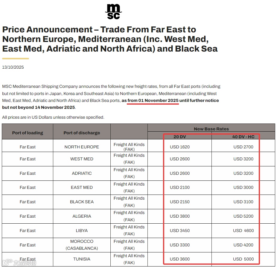 日前,多家船公司已开始宣布新一轮11月的运价调整计划。MSC、马士基、赫伯罗特、CMA等多家船公司继续调整部分航线的运费,涉及欧洲、地中海、非洲、南美、中东航线等。