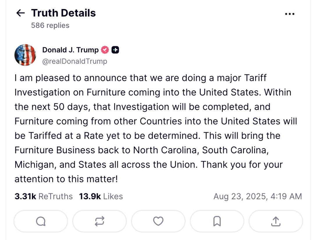 前两天特朗普在个人社交媒体平台上称,将会对美国进口家具展开关税调查,并将在50天内完成。并且表示,进口家具将会按照新的税率征收关税!