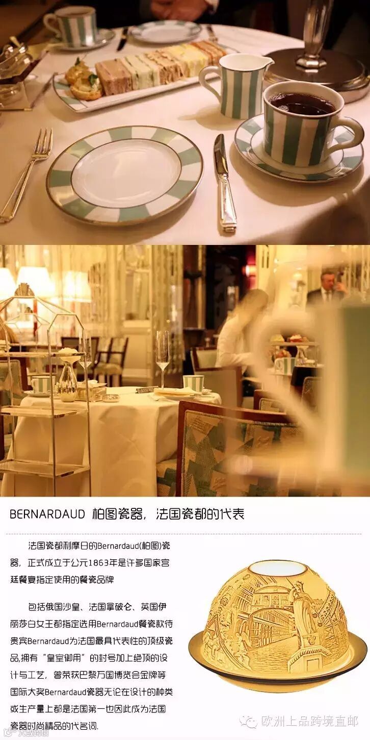 法国瓷都利摩日的Bernardaud瓷器,是许多国家宫廷餐宴指定使用的餐瓷品牌,包括俄国沙皇、法国拿破仑、英国伊丽莎白女王都指定选用Bernardaud餐瓷款待贵宾。其前身为1737年成立于利摩日之最古老的瓷艺品牌Ancienne Manufacture Royale。