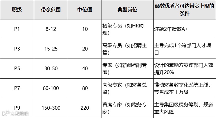专业序列(P):覆盖财务、法务、人力资源等职能岗,从P1(助理专员)到P9(首席专家),强调专业深度与跨部门支持能力;