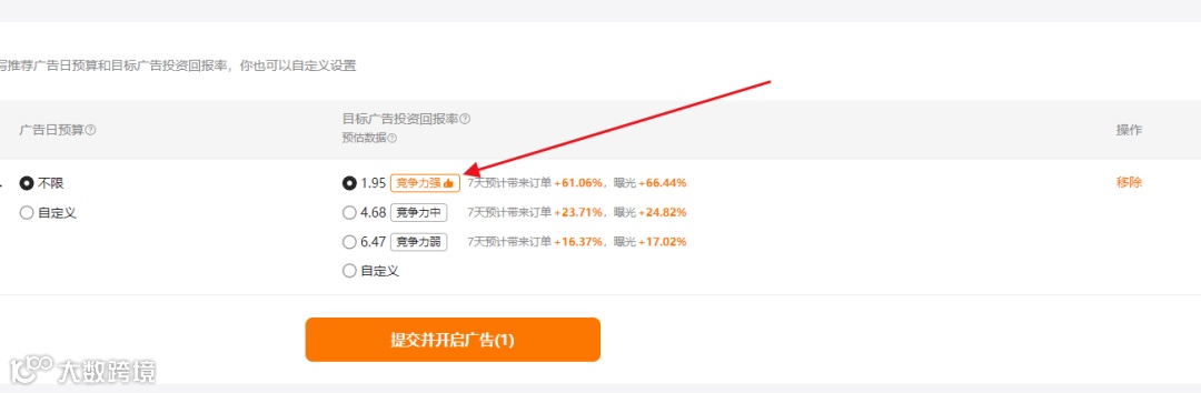 我选了“预算不限”,ROAS定了竞争力最强的那一档。ROAS,说白了,就是你每花1块钱广告费,能赚回多少钱。竞争力最强,就是ROAS最低,约等于2。意思是,我花1块,平台帮我赚2块回来,刨去成本,肯定亏钱。