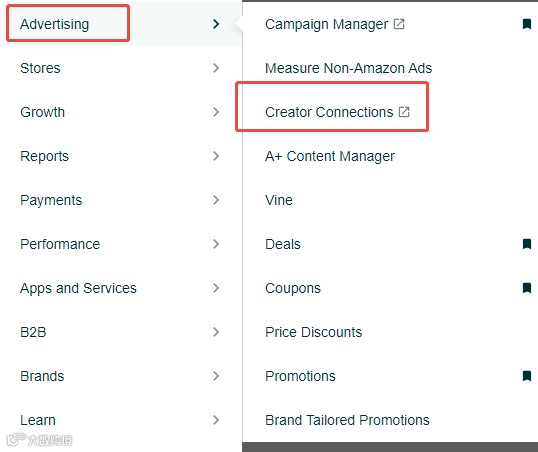 进入后台路径:卖家后台 → 广告(Advertising)→ Creator Connections。