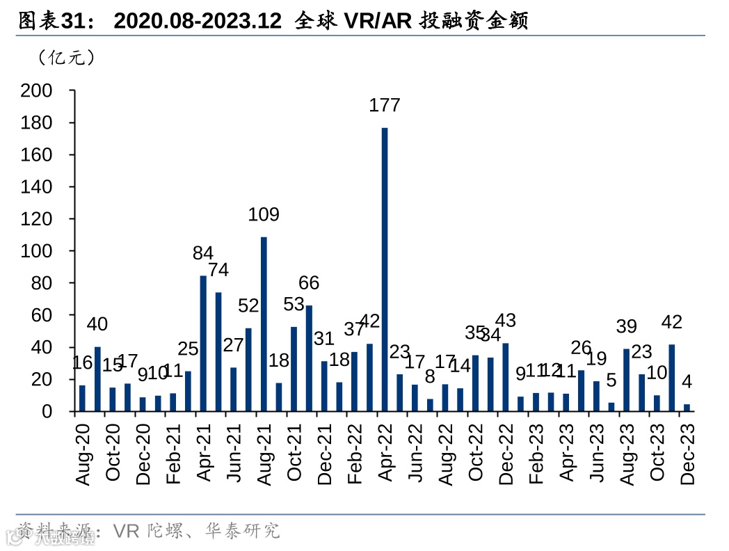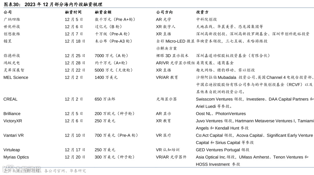 据VR陀螺,2023年12月全球VR/AR产业融资并购规模总额为4.41亿元,环比下降89.39%。按区域分,国内共有10起,国外有7起。其中海外VR/AR融资并购在内容和行业应用领域融资更为活跃,国内融资集中于硬件。镭昱完成Pre-A3轮战略融资,本轮融资资金将用于加速研发选代、团队扩建及小规模量产,进一步巩固镭昱在单片全彩Micro-LED微显示领域的领先优势。据映维网,澳大利亚医疗培训公司Vantari VR已完成700万美元的Pre-A轮融资,本轮融资将帮助该公司扩展到美国本地和国外的更多医疗保健组织。