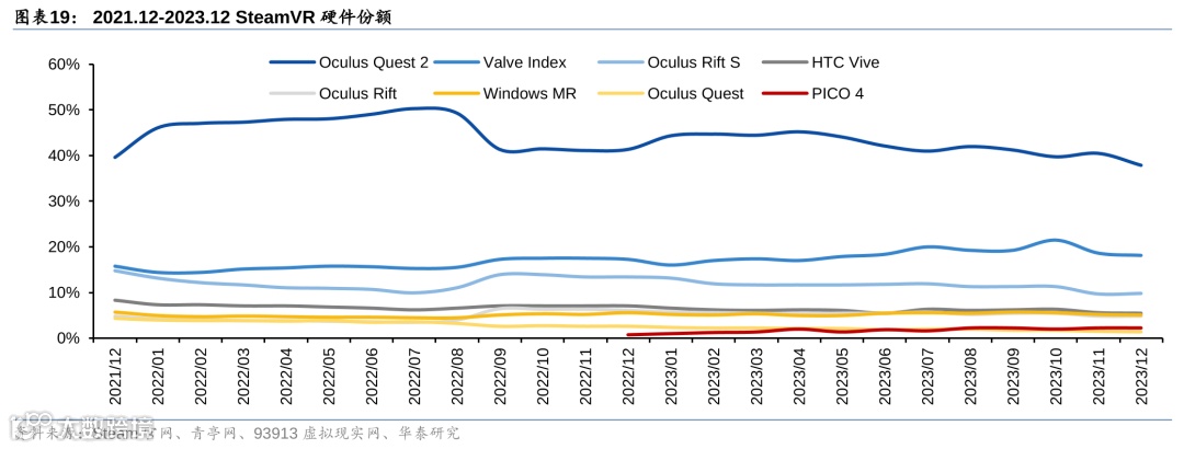 据93913虚拟现实网,2023年12月份的SteamVR活跃设备情况如下,与11月份数据进行对比:Oculus Quest 2:占比37.87%(环比下降2.58pct);Valve Index HMD:占比18.17%(环比下降0.48pct);Oculus Rift S:占比9.84%(环比上升0.15 pct)。在前三位的活跃VR设备中,Oculus Quest 2仍然继续占据绝对领先地位,即使占比略有下降,Valve Index HMD保持在第二位,Oculus Rift S则在第三位。