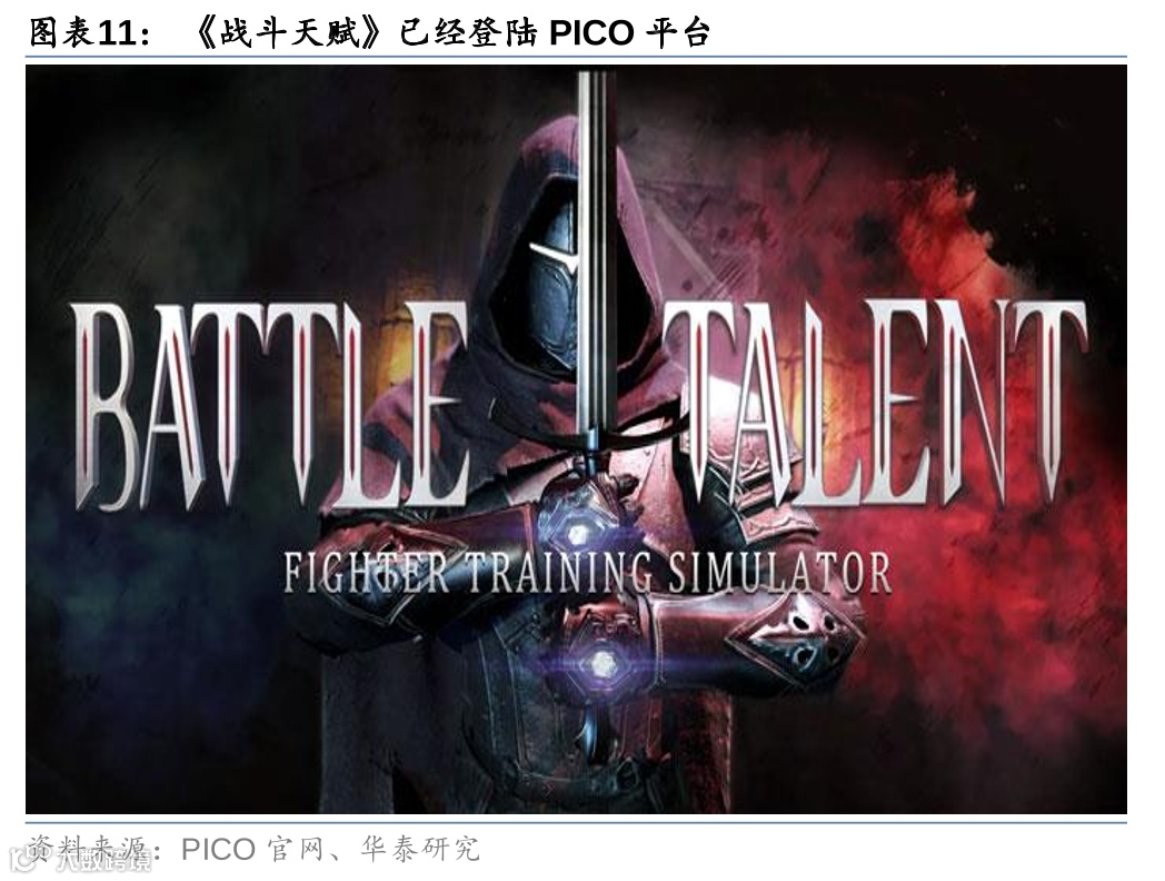 游戏内容呈现出蓬勃的发展态势。截至23年12月末,据Steam平台公布的统计数据,Steam平台上的游戏和应用总数达到了7765款,仅12月就新增了69款。据VR陀螺,Pico平台应用数量为595款,较11月(576)环比上升3.3%。23年登陆Quest和Steam平台的国产游戏《战斗天赋》(Battle Talent)已顺利在PICO上推出。作为一款剑斗类动作游戏,基于物理的玩法提升真实感和沉浸感,备受VR社区的青睐,在23年高通XR创新应用挑战赛中荣获了XR消费组白金奖和PICO优质游戏专项奖白金奖。截止24年1月29日,《战斗天赋》于PICO应用商店新品榜排行第二,评分达4.5/5.0。