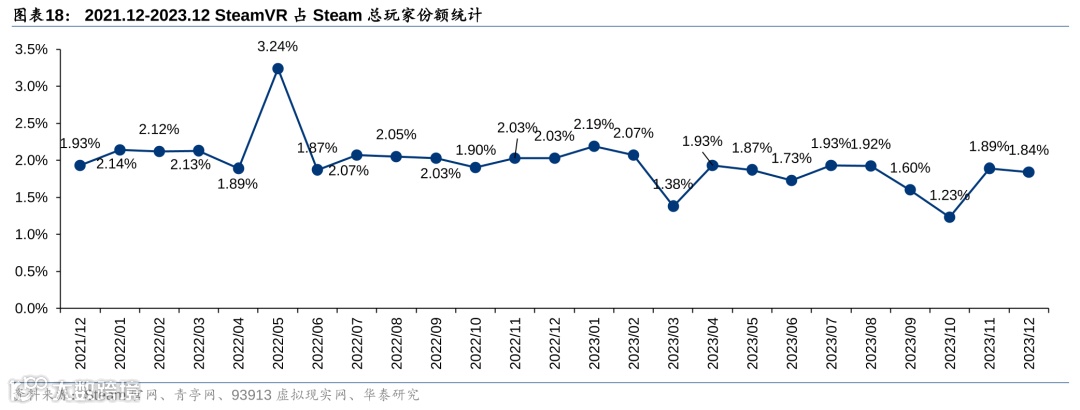 据Steam平台公布的统计数据,2023年12月SteamVR活跃玩家占Steam总玩家数量的1.84%,较2023年11月(1.89%)下降0.05pct。