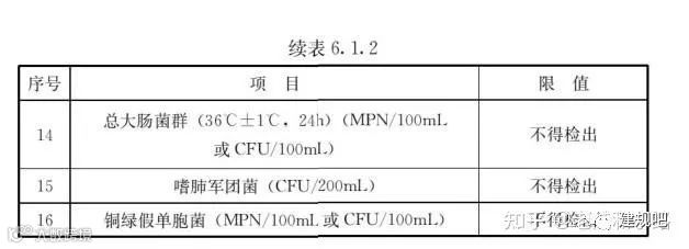 在理化指标中,用色、浑浊度、臭和味、肉眼可见物、pH、耗氧量(未采用纳滤、反渗透技术)、余氯、二氧化氯(适用于二氧化氯消毒)、电导率(纯水)能够反映总体水质状况,检验操作比较简易,又可以用在线仪表;周检项目中,有细菌总数、总大肠菌群、粪大肠菌群、耗氧量(采用纳滤、反渗透技术),用以分别说明肠道致病菌和有机污染总量;每年检验一次全分析是必要的,用以说明供水的全面情况;如果企业标准所设的检验项目和频率严于本表规定,可按企业标准执行。