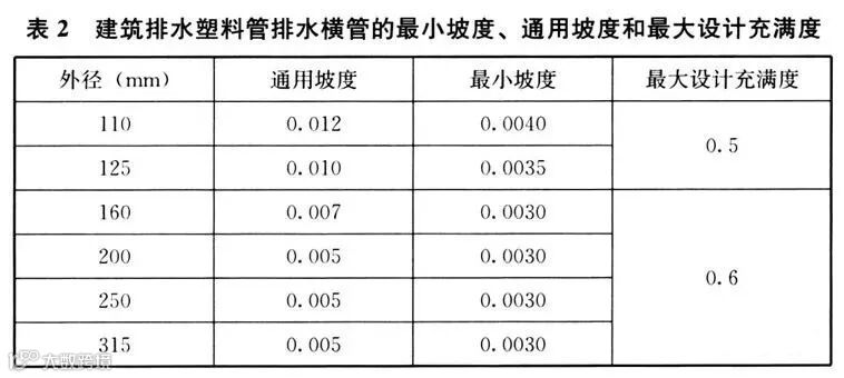 (2)建筑排水塑料管排水横管的最小坡度、通用坡度和最大设计充满度,见表2。
