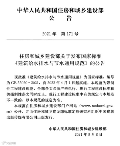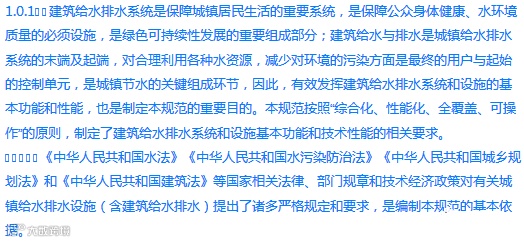 1.0.1为在建筑给水排水与节水工程建设中保障人身健康和生命财产安全、水资源与生态环境安全,满足经济社会管理基本需要,依据有关法律、法规,制定本规范。