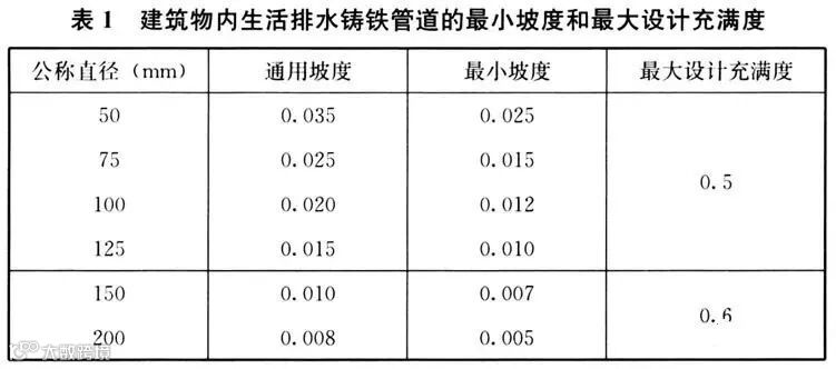 建筑物内生活排水铸铁管道的最小坡度和最大设计充满度见表1。