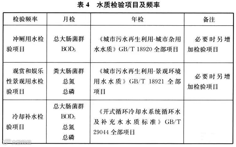 水质检测取样点应设在中水清水池(箱)或处理后的产品水总出水点。水质检验项目及频率按表4进行。