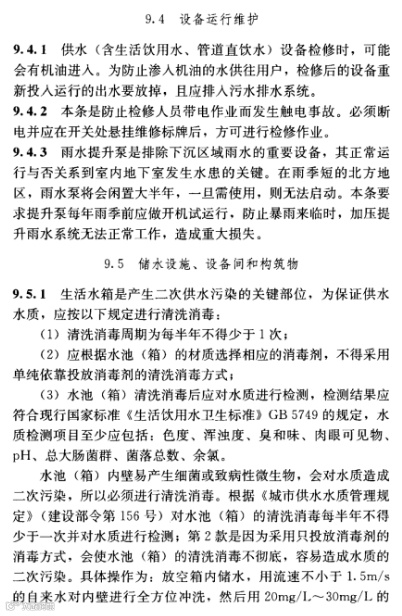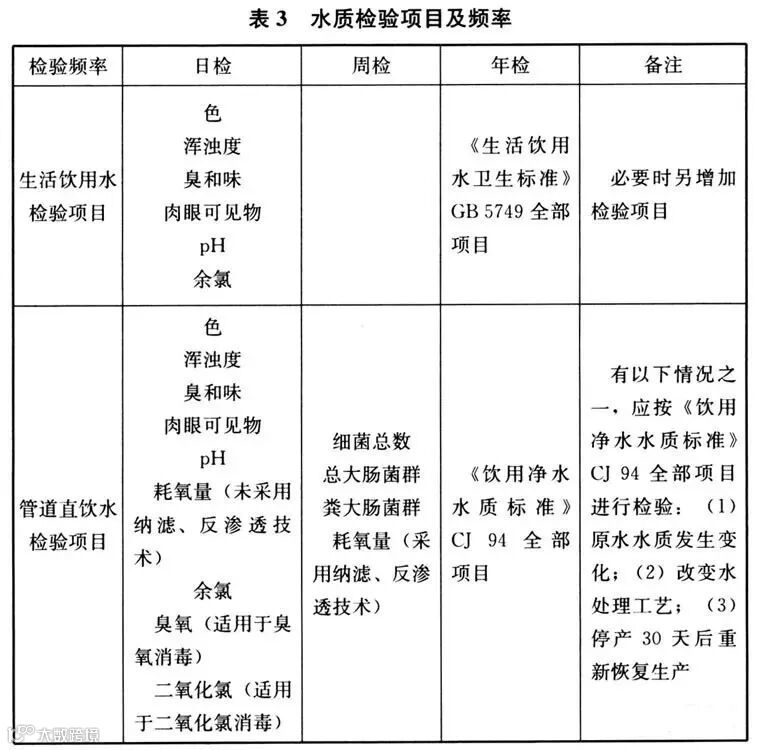 9.2.1 生活饮用水(含管道直饮水)、集中生活热水水质安全问题直接关系到民生健康,为保证供水质量和安全,运行管理者应进行日常水质检验。检验项目和频率从能保证供水水质和供水安全出发,并考虑所需费用。检测水质指标不符合国家现行标准《生活饮用水卫生标准》GB 5749和《饮用净水水质标准》CJ 94中规定的限值时,应及时查明原因,并采取相应措施。水质检验项目及周期按本表3进行。