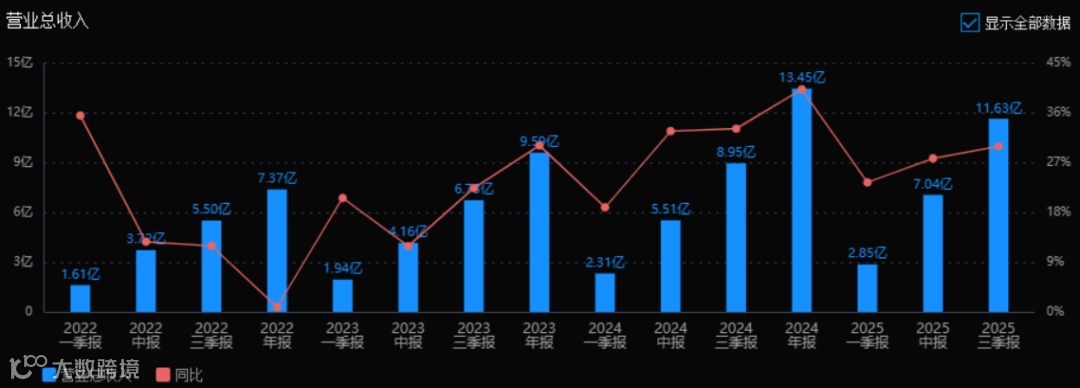 2025年三季度的营业总收入为11.63亿元,相较于2024年三季度的8.95亿元,增长了29.91%。