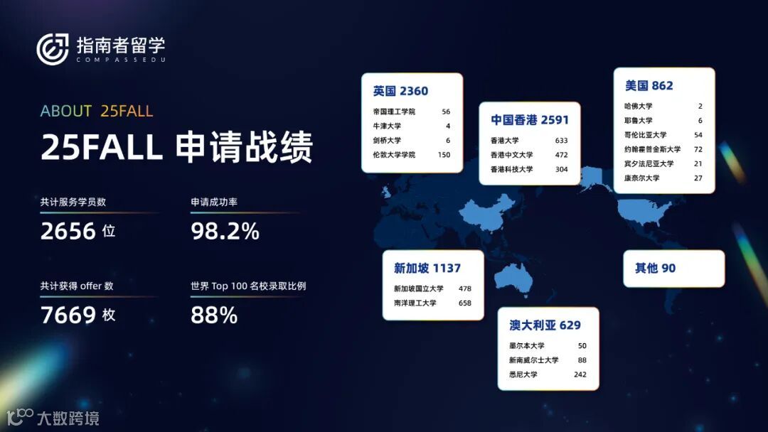 突出战绩:在2025申请季中,指南者留学共帮助2656位同学斩获7669枚offer,申请成功率98.2%,世界Top100名校offer占比88%。