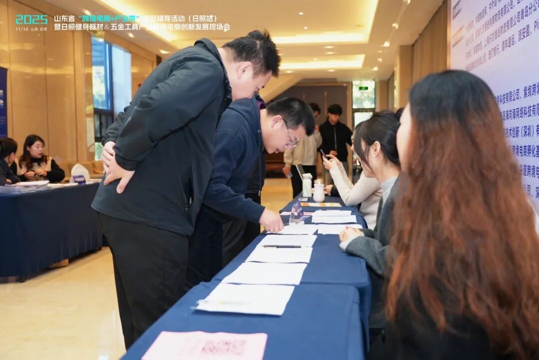为促进产业与服务的精准匹配,会议同期举办健身器材&五金工具产业带资源对接会。现场设有平台服务商、物流支付服务商、技术服务商及院校合作四大展区,近百家日照本地企业与各类服务商开展面对面洽谈。