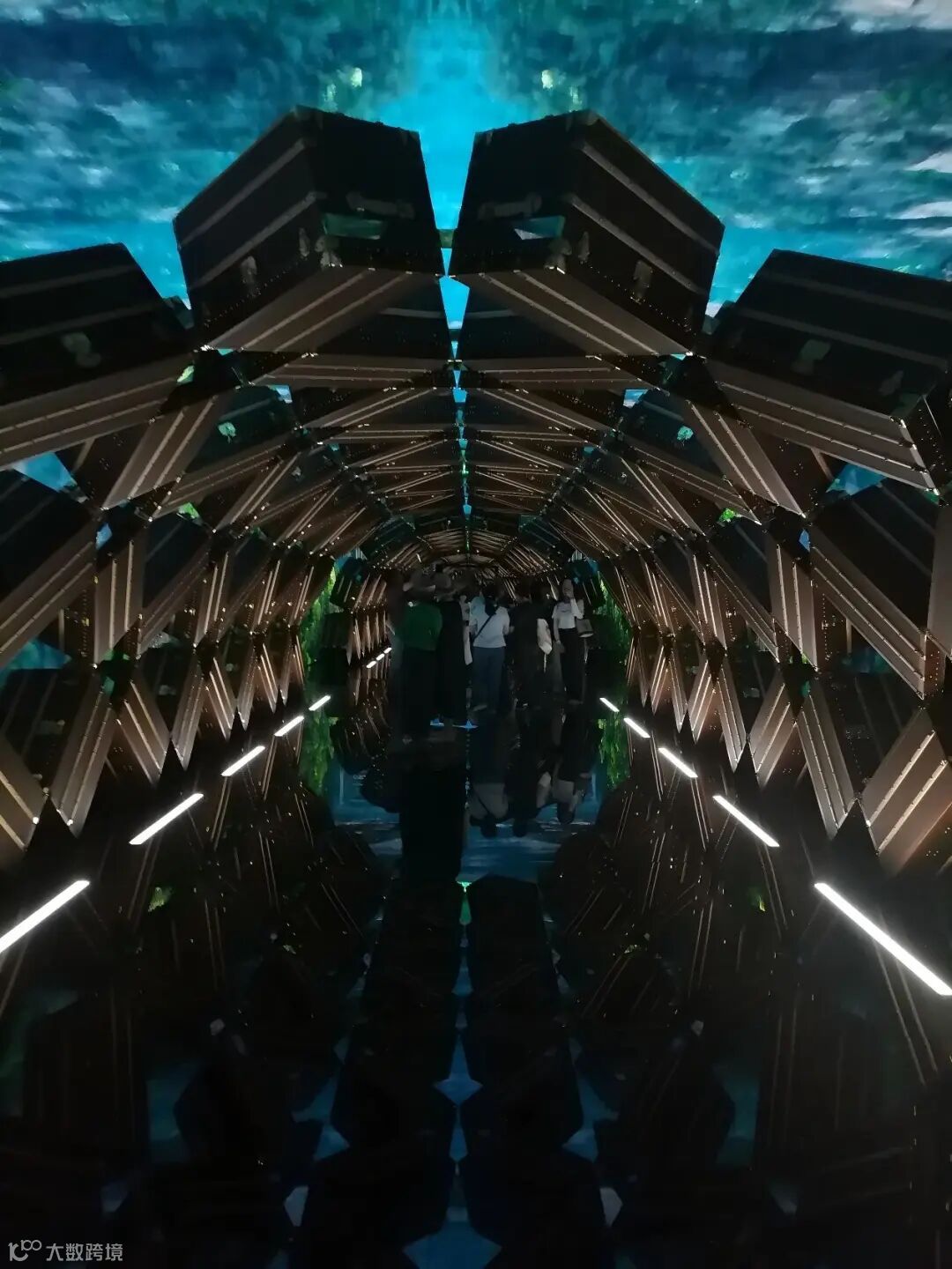 随后印入眼帘的是由五面镜面(顶、地、两边+对面)与LV旅行箱组合成的“摆渡桥”(我自定义的)。由于有投影,镜面会被投影画面,是动态的,所以要是盯着画面看,会失去方向感的哈哈。