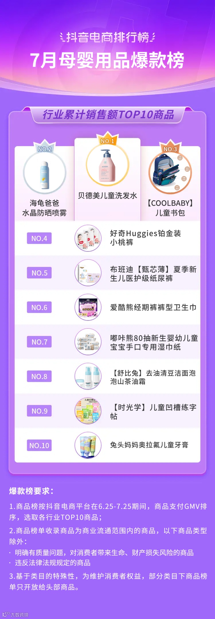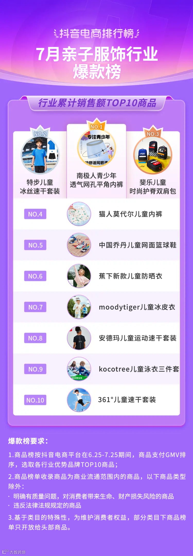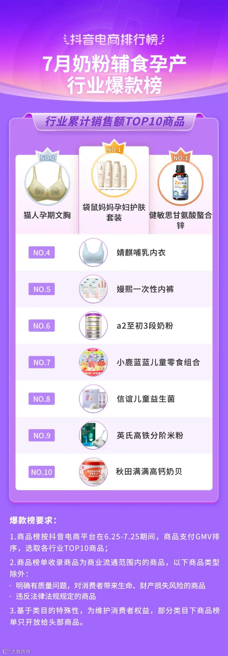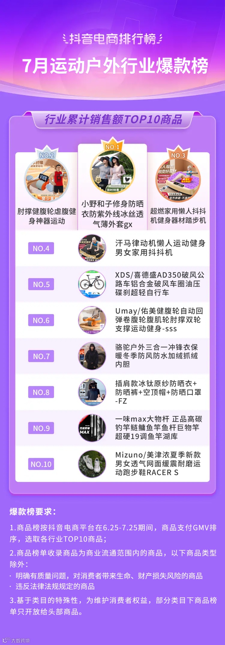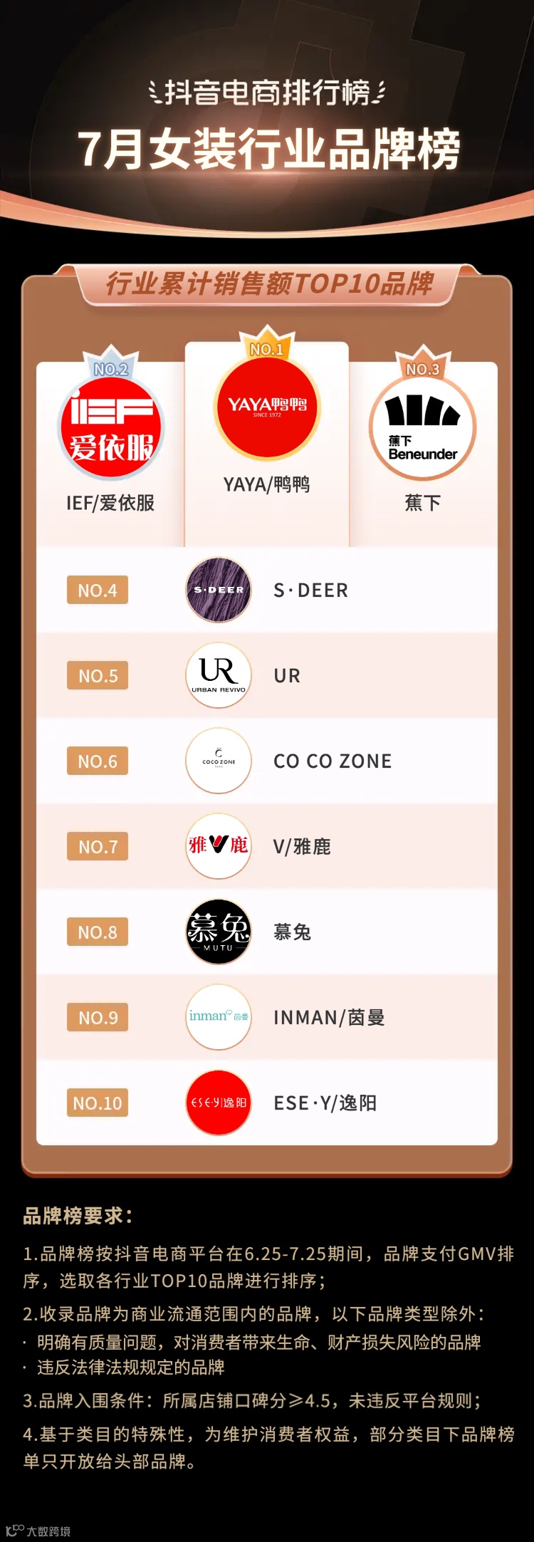 本月,克劳锐继续联合抖音电商发布7月抖音电商各维度榜单,本期榜单相比5月加入了与商家的对话,帮助大家更好地理解抖音电商生态的发展趋势。 同样的,本期7月榜单克劳锐根据品类总GMV、用户需求度以及品类购物频次等方面因素,将榜单按照主要消费品类、成长消费品类、趋势增长品类作了三类划分,并将对每个品类做具体解读。总结7月榜单我们发现,部分主要消费品类有了较大变动,黑马品牌持续涌现,譬如美妆行业下肌肤未来跃居品牌榜第三名,女装行业下爱依服跃居品牌榜第二名,运动户外品类下耐克跃居品牌榜第二名。此外,其余主要消费品类也有些许变动,新品牌上榜现象频发。由此证明,抖音电商生态各品类还存在增长空间,商家需要结合自身产品特点进行投流、达人等资源匹配,成功在垂类赛道打出声量与销量。从爆款产品上看,7月出现了反季产品的销售热潮,羽绒服占据了7月女装行业爆款榜的大部分席位。此外,健腹轮产品也占据运动户外爆款榜大部分席位。整体上看,大部分爆款榜依旧呈现出消费的随机性。本月通过与商家的对话,克劳锐发现不少商家坚定认为抖音电商生态还存在一定机遇,譬如黑马品牌小鹿蓝蓝的相关负责人就认为,抖音电商已经成为母婴市场正增长的重要渠道,而消费者也不再迷信所谓的大品牌、进口货,国货的力量在崛起。总而言之,极致的性价比是当前用户购物消费的核心,产品力、运营力与内容力的结合能够帮助商家取得更好的业绩。商家需注重用户体验,通过个性化推荐、精准定位等手段,为用户提供个性化的购物体验,提高用户的购买意愿和满意度。注:①主要消费品类下辖美妆、食品饮料、女装、男装、运动户外、亲子服饰、奶粉辅食孕产、母婴用品、个护、纸品家清、清洁工具、酒水②成长消费品类下辖3C数码、玩具潮玩、图书教育、宠物行业、珠宝行业、奢侈品行业、家电行业、家居日用③趋势增长品类下辖跨境、家具家装、滋补保健、汽车、鲜花园艺主要消费品类本月主要消费品类下各垂类有了较大变动。典型如女装行业榜单产生了较大变动,爱依服、S·DEER、UR、CO CO ZONE、雅鹿等多家品牌上榜;美妆行业也有了极大变化,肌肤未来、薇诺娜、柏瑞美、毛戈平、欧诗漫、HBN成为新上榜品牌。其余品类也均有品牌变动,新上榜品牌继续涌现。在对话中,不少商家表示在抖音电商生态内,要将兴趣和需求作为最好的出发点,内容作为最好的媒介,最终促成品牌价值和销售转化的双重提升。下面一起来看7月抖音电商主要消费品类各榜单详情——