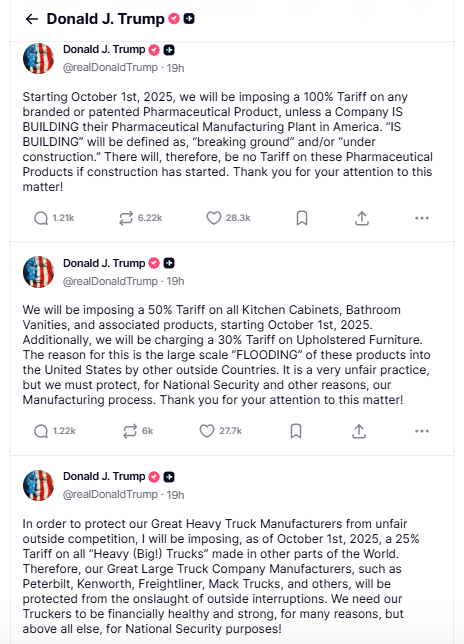 他在社交媒体“Truth Social”上宣布,自2025年10月1日起,将对多类进口产品加征高额关税。