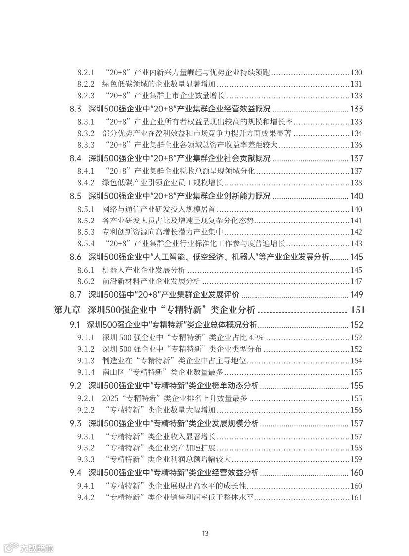 - “20+8”产业集群企业:2025年深圳500强企业中“20+8”产业集群企业249家。绿色低碳领域企业数量显著增加,网络与通信、软件与信息服务等核心产业营收、资产与上市数量增长显著。