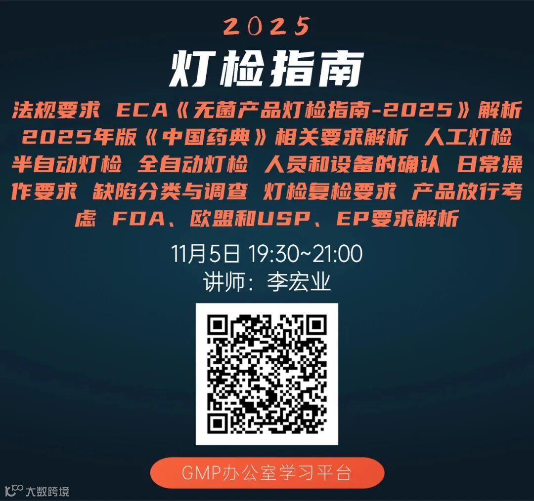 GMP办公室学习平台已推出《灯检指南:法规要求、ECA《无菌产品灯检指南-2025》解析、2025年版《中国药典》相关要求解析、人工灯检、半自动灯检、全自动灯检、人员和设备的确认、日常操作要求、缺陷分类与调查、灯检复检要求、 产品放行考虑、FDA、欧盟和USP、EP要求解析!》培训课程,扫描下图二维码可进入学习: