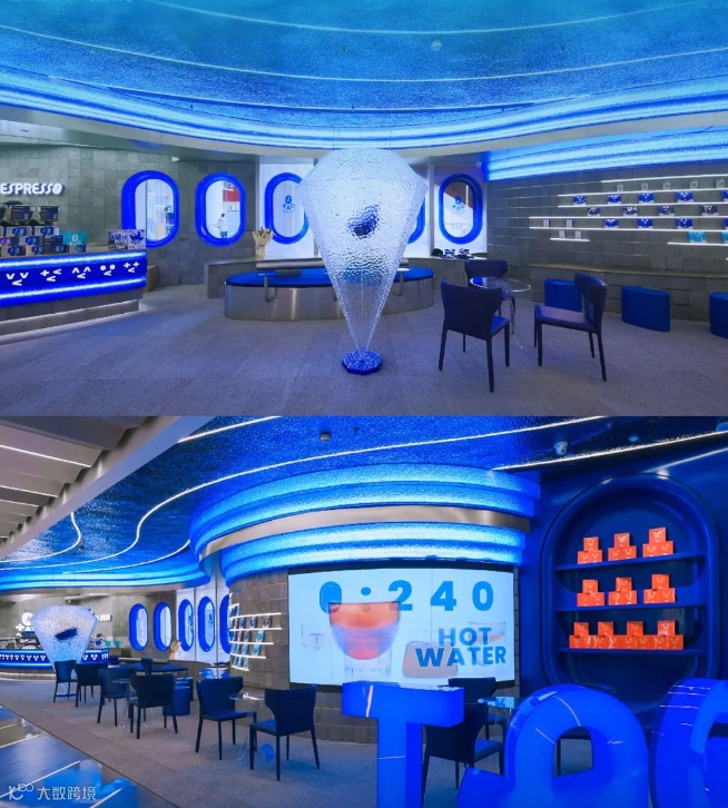 此外,2022年,TAG泰阁咖啡中国首店落子江苏镇江,凭清凉又吸睛的海洋系门店,成为打卡热地。产品以“蓝色”为灵感,如蓝藻丝绒拿铁、海风椰椰和一口蔚蓝等,度假感拉满。不到2年,已开出18家门店,在重庆、成都、广州等地拿下多个区域好评榜Top1。