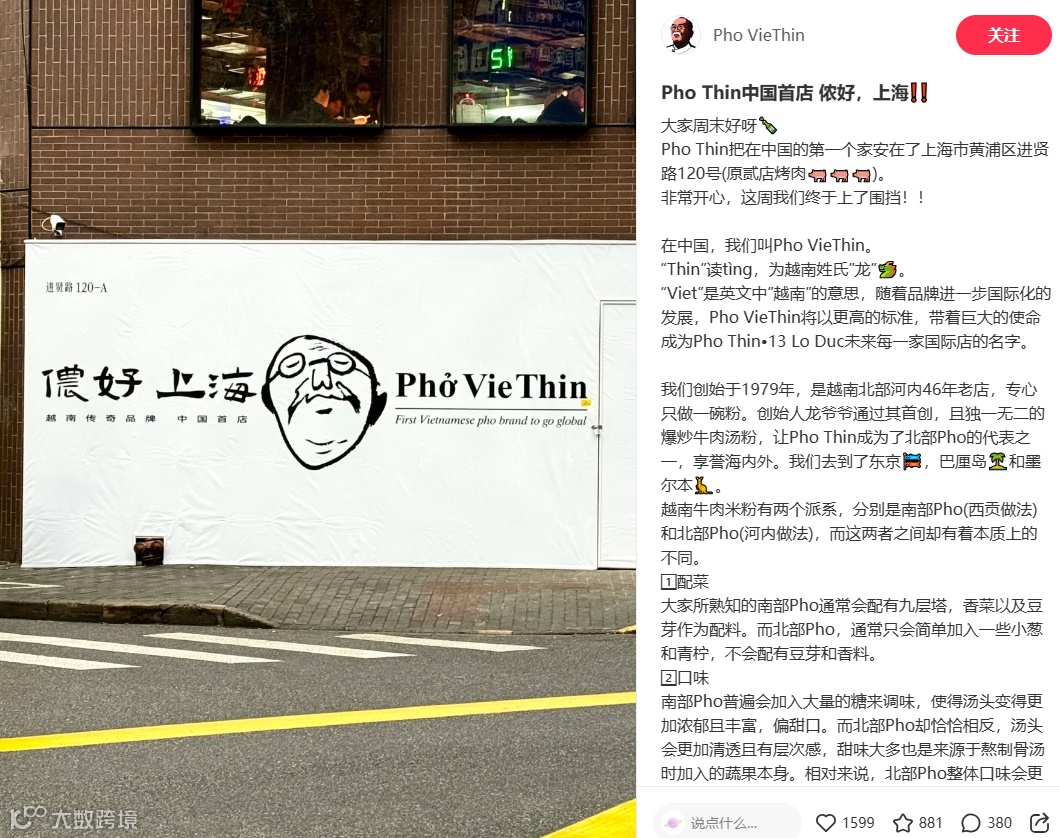 对比之下,今年刚在上海围挡越南牛肉粉Pho VieThin,未开已在小红书出圈,造势营销和网友互动收获近2千多人关注的。