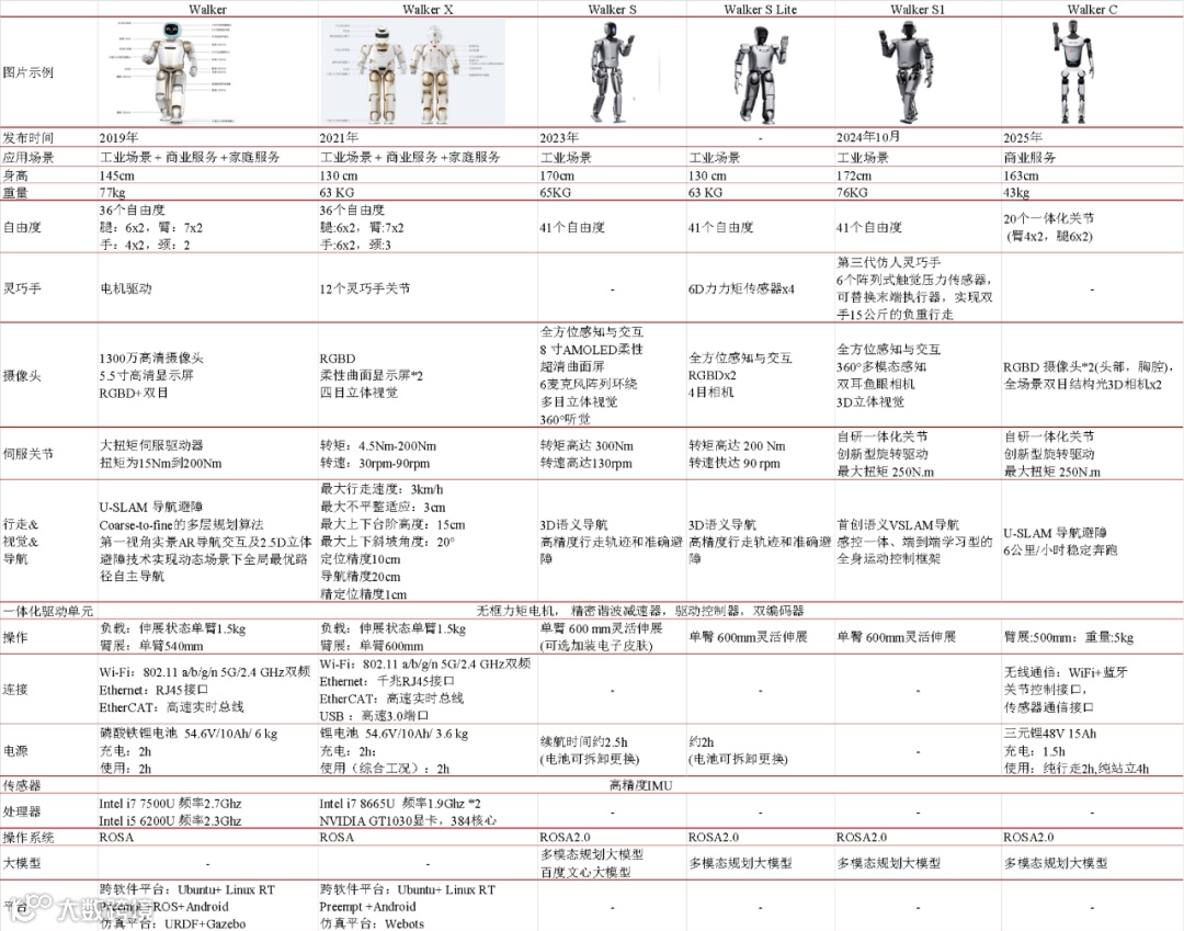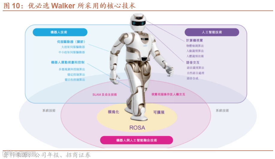 优必选以智能服务机器人技术为核心,围绕家庭、商用、工业三大应用场景,持续拓宽产品矩阵。公司成立于2012年,2014年成功研发并生产出小型家庭机器人——Alpha,2016年,540台Alpha机器人登上央视春晚舞台。2019 年,公司发布第二代 Walker 机器人,具备 36 个高性能伺服关节以及力觉、视觉等全方位的感知系统,可以实现平稳快速的行走和灵活精准的操作,能在常用家庭场景自由活动和服务。2021年,新一代 Walker X 机器人发布,进一步提升了性能和智能化水平,为家庭和商业服务提供更好的支持,2022 年,首批 Walker X 已落地沙特NEOM新未来城,成为第一代大型人形机器人 “市民”,为人们提供智能化服务。