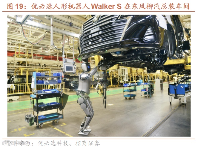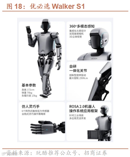 优必选目前共有6款人形机器人,其中Walker S系列主要用于工业场景,Walker、Walker X、Walker C主要用于商业及家庭服务场景。汽车、3C等工业场景对效率要求高,但仍有部分工序依赖人工,人形机器人能够通过训练完成如打螺丝、搬运等任务,应用潜力巨大,因此工业场景是公司重点投入和迭代的领域,也是未来几年人形机器人有望率先落地应用的场景。我们在本部分将重点分析用于工业场景的Walker S系列机器人的技术方案和商业化进展。