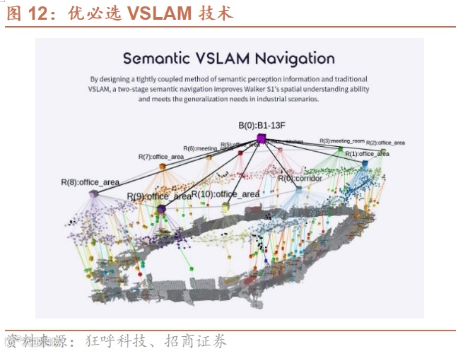 Walker S建立了全方位的感知系统。在人形机器人领域,传感器技术是构建感知层的关键,让机器人得以像生物一样感受周围环境,实现与世界的互动。主要的传感器涉及视觉、听觉、触觉、力控、位置和姿态惯性传感器等。Walker S搭载了多维力觉、多目立体视觉、全向听觉和惯性、测距等全方位的感知系统;具备行业领先的多模态传感器融合技术、动态环境反馈整合和自主环境探索技术等,全方位感知环境与人事物。行业首创语义VSLAM导航:通过设计语义感知信息与传统VSLAM紧耦合方法,实现由粗到精的二阶段语义导航,提升了Walker S1对空间的理解能力,满足工业场景泛化需求。