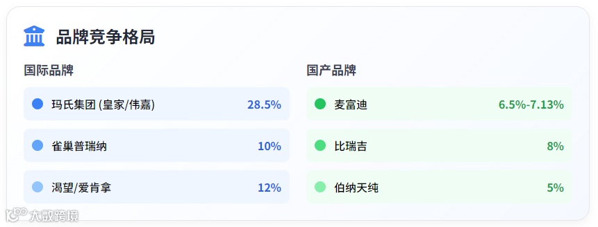 中国猫粮市场呈现明显的 "国际品牌主导高端、国产品牌崛起中端" 的竞争格局。国际品牌方面,玛氏集团以约 28.5% 的市场份额持续领跑,其旗下皇家(ROYALCANIN)与伟嘉(WHISKAS)双品牌策略成效显著,高端猫粮产品线贡献集团在华收入的 62%。雀巢普瑞纳以约 10% 的市场份额位居第二。