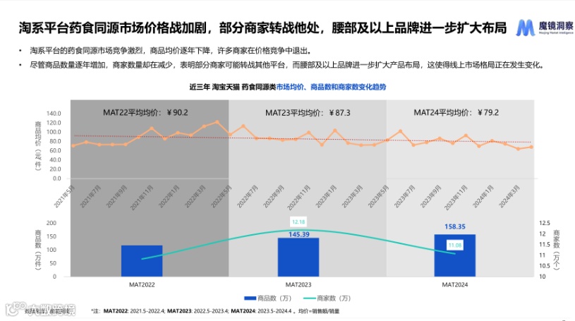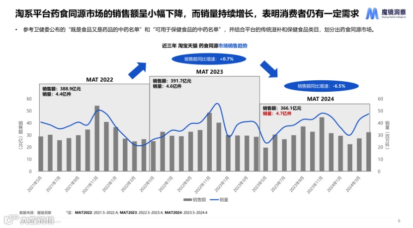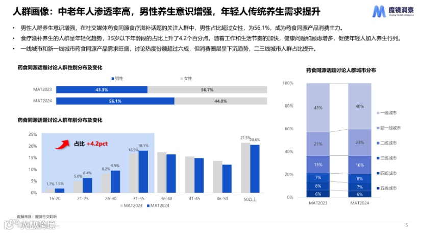 - 药食同源市场概览:食疗滋补在消费者中意愿强烈,营养健康食品市场涨势迅猛,人群画像:中老年人渗透率高,男性养生意识增强,年轻人传统养生需求提升,淘系平台药食同源市场的销售额呈小幅下降,而销量持续增长,表明消费者仍有一定需求。