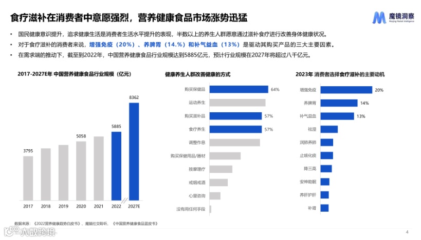 盒马、山姆、永辉等商超平台成为重要竞争参与者,通过自有品牌打造(如盒马 "盒补补")、独家产品开发、场景化陈列重塑市场格局。 - 互联网健康企业