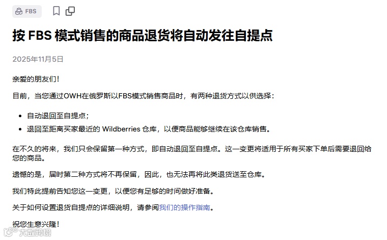 2025年11月5日,Wildberries 官方发布了一条重要通知:FBS模式销售商品的退货方式即将调整。这对我们在平台上的日常运营和物流管理有直接影响,今天就帮大家梳理一下重点信息,让大家提前做好准备。