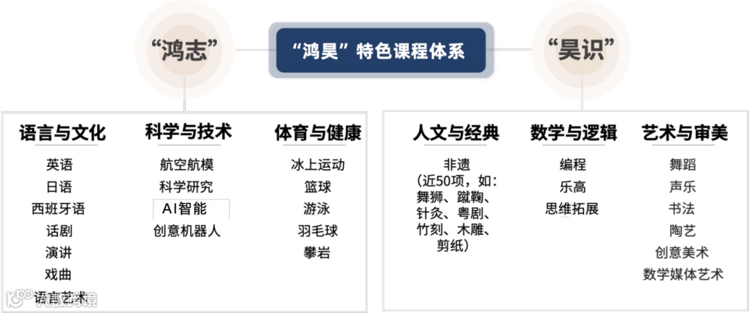 校本课程“鸿昊”课程,包括“鸿志”和“昊识”两大课程群,聚焦学校育人目标,整体规划课程内容涵盖人文与经典、语言与文化、数学与逻辑、科学与技术、艺术与审美、体育与健康等六大领域。