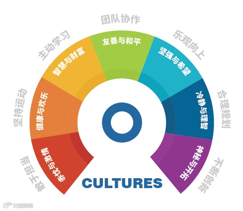 学校的德育文化,以七种色彩象征不同的品质,鼓励学生敢于担当、坚持运动、主动学习、团队协作、乐观向上、理性规划和不断创新,帮助学生学会展现自我,成就最好的自己。
