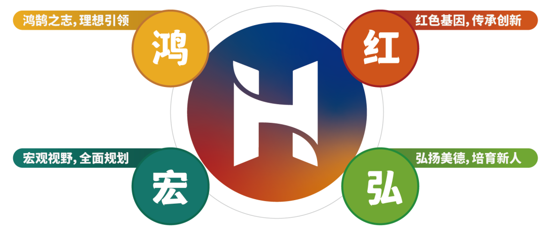 学校从“鸿”的目标--鸿鹄之志,树立远大的理想和抱负;“宏”的载体-宏观视野,全面规划,尊重个性、全面发展;“红”的传承-深入挖掘红色文化资源,构建核心价值观;“弘”的核心--弘扬中华民族传统美德,培育具有高尚品德和良好行为习惯的新时代青少年。
